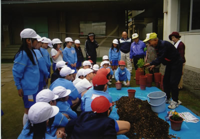 教育会支部の校区活動費を活用して、学校が花の土と、ビオラやポリアンサスの苗を購入。会員の一人が自宅から持参したマリーゴールドの苗も含めて、4年生児童、教職員、教育会OBが協力して、一鉢ずつていねいに植えた。 学校環境の美化に協力するとともに、先生方や児童と交流することができて有意義であった。本校区ではこの活動をはじめて3年目、卒業式の頃には満開の花が卒業を祝ってくれると喜ばれている。 |