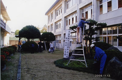 「えひめ教育の日」関連事業として、寒川地域OB会の有志がボランティア活動として実施。昨年は暑い夏休み中にしましたが、時期的にも丁度良かった。ウバメガシ、木犀、つつじ、そてつ、ざくろ、つげ等を剪定しました。やはり剪定すると大変きれいになり、見違えるようになりました。 児童達が少しでも良い環境で学習が出来るように願っての活動です。 |
