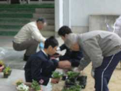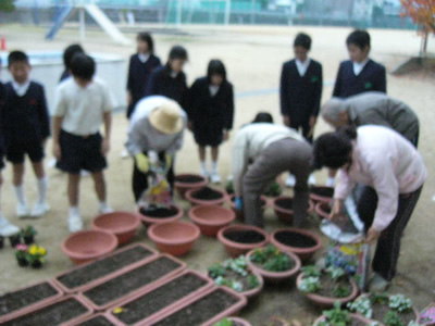曇り空の中、事前に案内していた教育会の皆さんが来てくださり、子ども達と一緒にプランターへの土入れ、花の苗の植え付け、水やり等に楽しく活動していました。 当日は会が重なってやむを得ず欠席された方もいらっしゃいますが、子ども達の前で自己紹介する教育会の皆さんは、はつらつとして久しぶりに子ども達と交流ができることを楽しみにしてくださっていました。 プリムラ、チューリップ、パンジー、ビオラ、サクラソウ等教育会の皆さんと子ども達、現職教職員が一緒になって植えたり、並べたりとても楽しい活動でした。 ペアになって活動していた子ども達は、この後の花の世話を託されて、元気よく返事をし、力強く握手を交わす風景が見られました。 |