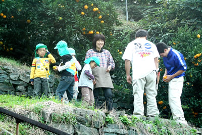 日頃から交流を深めている川之石保育園の皆さんを迎えて、みかんの収穫を楽しみました。園児たちは段々畑に昇り、高校生の話を聞きながら、きれいに色づいた果実を1つ1つ丁寧にハサミで摘み取りました。 もちろん、甘酸っぱいみかんの味も十分楽しむことができました。 |
