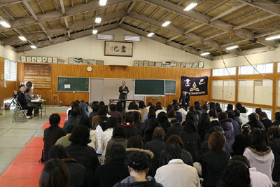 まず学校側から、 2年生になった時のクラスの類型や授業科目の選択について説明しました。 次に現在の進路状況と今後の取り組み方について説明をしました。 保護者からもいくつか質問が出され、 より具体的に理解が深められたようです。 本校では、 毎年保護者の出席しやすい休日に実施しています。 今回は「 親子で目指す進路実現」 というテーマで、 外部業者による講話も取り入れました。 例年より多い約6割の保護者が出席して、 子供の進路に関する話に真剣に耳を傾けていました。